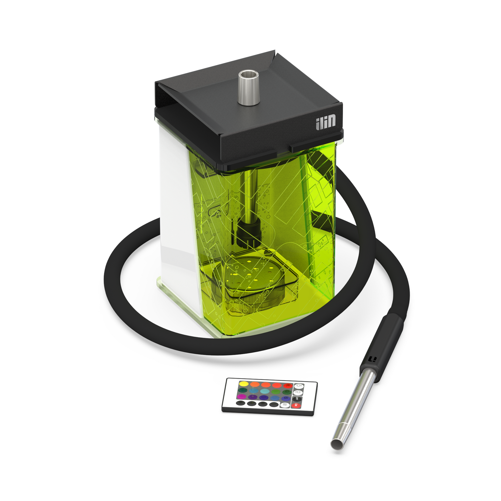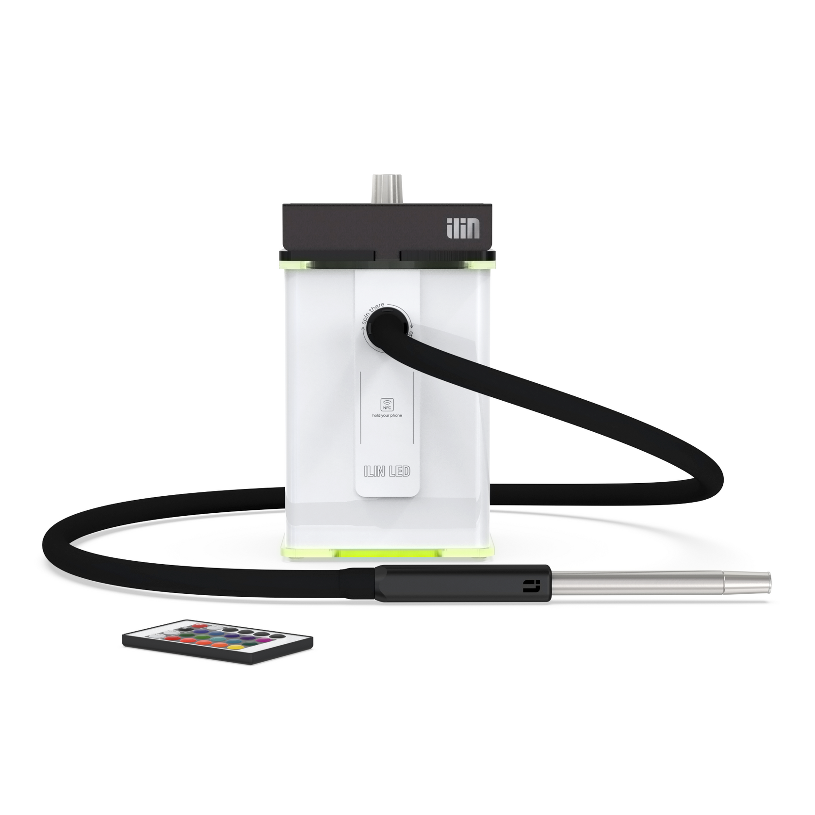 Кальян ILIN LED: Колба, Шахта и блюдце из нержавеющей стали, Уплотнитель для чаши, Шланг, Магнитный коннектор, Мундштук ILIN, Подсветка с пультом, Антисплеш (брызговик).