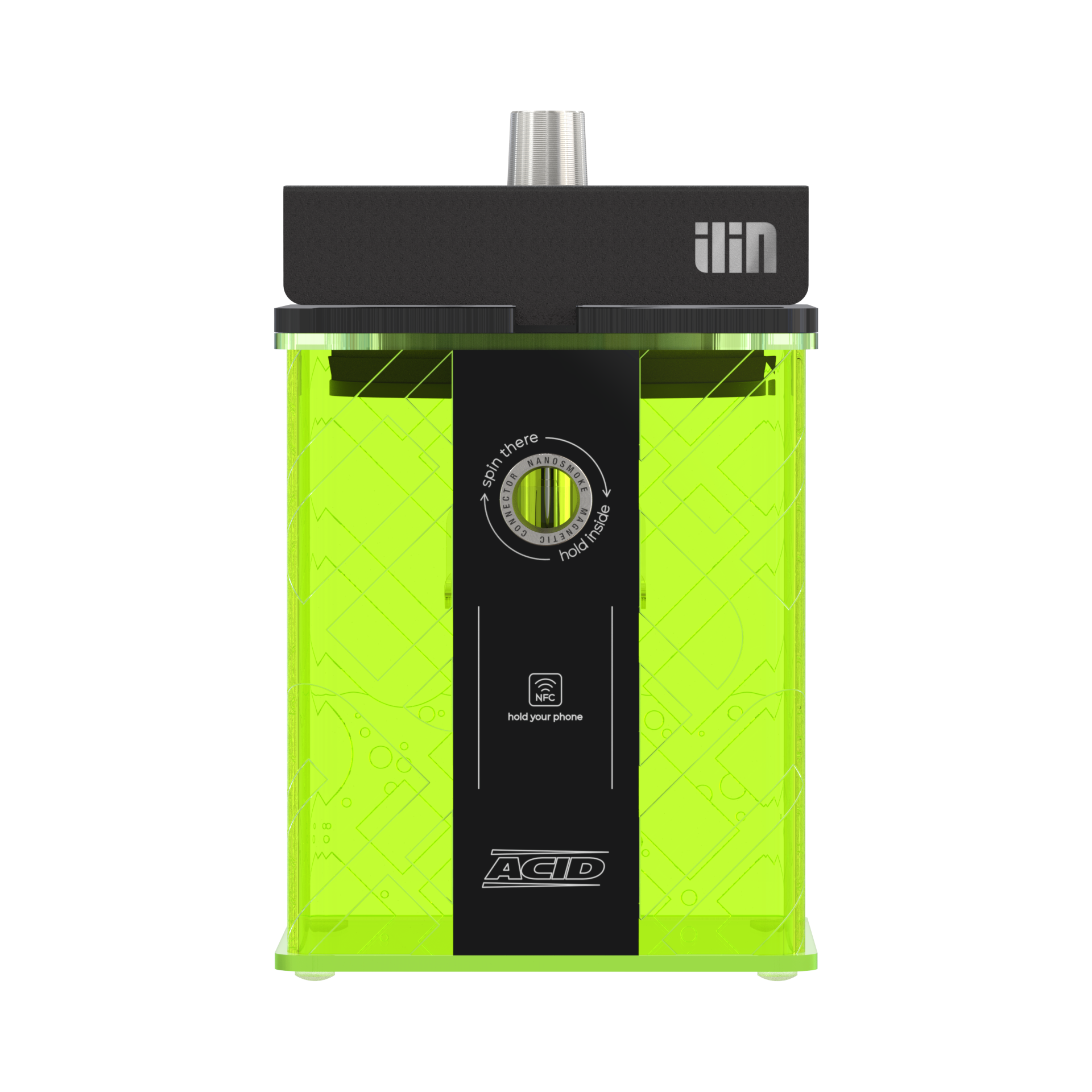 Кальян ACID: Колба, Шахта и блюдце из нержавеющей стали, Уплотнитель для чаши, Шланг, Магнитный коннектор, Мундштук ILIN, Антисплеш (брызговик).