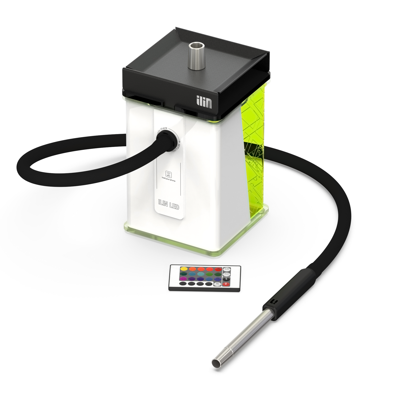 Кальян ILIN LED: Колба, Шахта и блюдце из нержавеющей стали, Уплотнитель для чаши, Шланг, Подсветка с пультом, Магнитный коннектор, Мундштук ILIN, Антисплеш (брызговик).